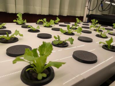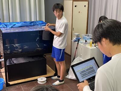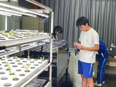 魚を飼育しながら英用水を循環させて野菜を育てるアクアポニックスシステムが稼働しています。プロジェクトチームの生徒たちが水質検査を行いながら水質を最適な状態に保っています。レタスをどんどん育てて、保護者や地域に方々に販売したいと思いますので、よろしくお願いいたします。