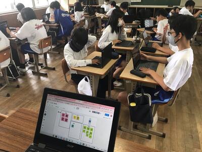 学校関係者や教育委員会の方々、事務局の指導主事、様々な方々が視察に来校していただいています。端末活用の状況や生徒に委ねる学校教育の様子についてです。生徒も慣れてしまっています。