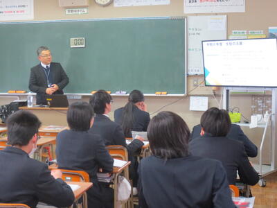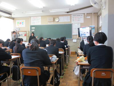 2年生を対象に、高校へ関心をもち、これから進路選択に向けて具体的に考えることができるように、高校の先生方に来ていただいて、学校の説明会を行いました。