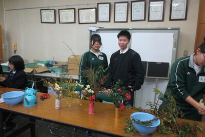 学校支援ボランティアの方にお越しいただき、茶華道体験をしました。生徒たちは自分たちの感覚を大切しながらも、ボランティアの方たちからのアドバイスを聞き、工夫を凝らしながら楽しそうに花を生けていました。