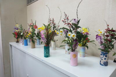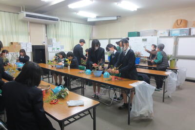 先日の一期一会の会で「生け花教室」を行いました。一期一会の会は、様々な活動を通して、地域の方やPTAの方、そして異学年が交流できる場です。花の生け方を教えていただきながら、生徒たちは工夫しながら取り組んでいました。なかなかの力作がそろい、生けられた花は、後で校内にも飾られました。