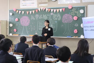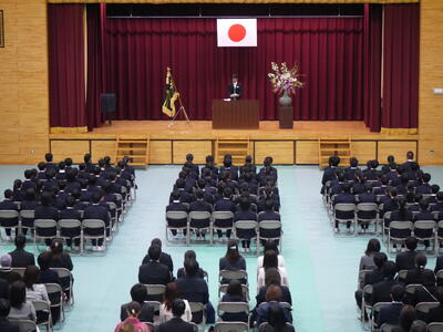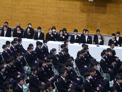 令和8年4月9日(木)に令和8年度の入学式が行われました。今年度は160名の新入生を迎え、盛大かつ厳粛な雰囲気の中で行われました。少し大きめの新しい中学校のブレザー制服を身にまとい、緊張した面持ちではありますが、希望にみちた瞳でしっかりと前を向いて話を聞いていました。