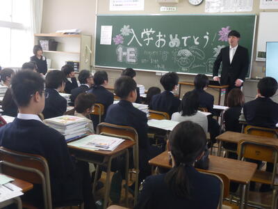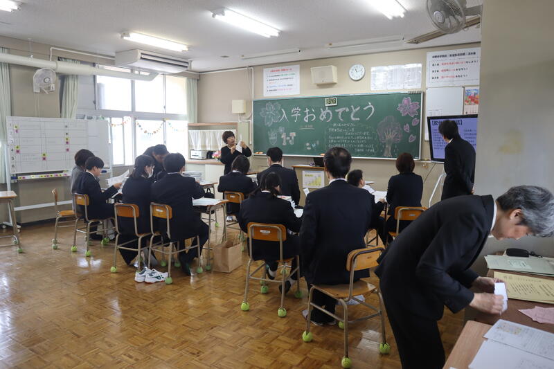式後の学活では、中学校で使う教科書を受け取り、担任の先生から、様々な説明を受けていました。
