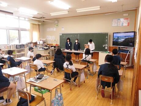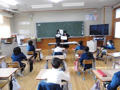生徒会執行部・文化委員会。有志のみなさんが各学級の朝の時間に読み語りをしてくれました。このために中学校でそれぞれの学年に合った本を選んだり、読む練習をしたり、クイズを考えたりと準備をしてくれていました。児童たちも真剣に聴き、積極的にクイズにも答えていました。お礼もしっかり言えました。