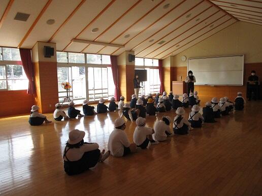 午前中に来年度、本校に入学予定の園児のみなさんがてくれ、1年生と交流し、楽しい時間を過ごすことができました。1年生は朝から「来てくれる園児のために」とロウカや多目的ホールを一所懸命、掃除をしてくれました。そして学校の紹介や学習発表会で行った音読劇「くじらぐも」の発表、昔遊び等を行ってくれました。
